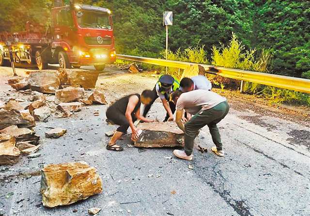 城口县明通镇党员干部在清理道路上的碎石块。(受访者供图)